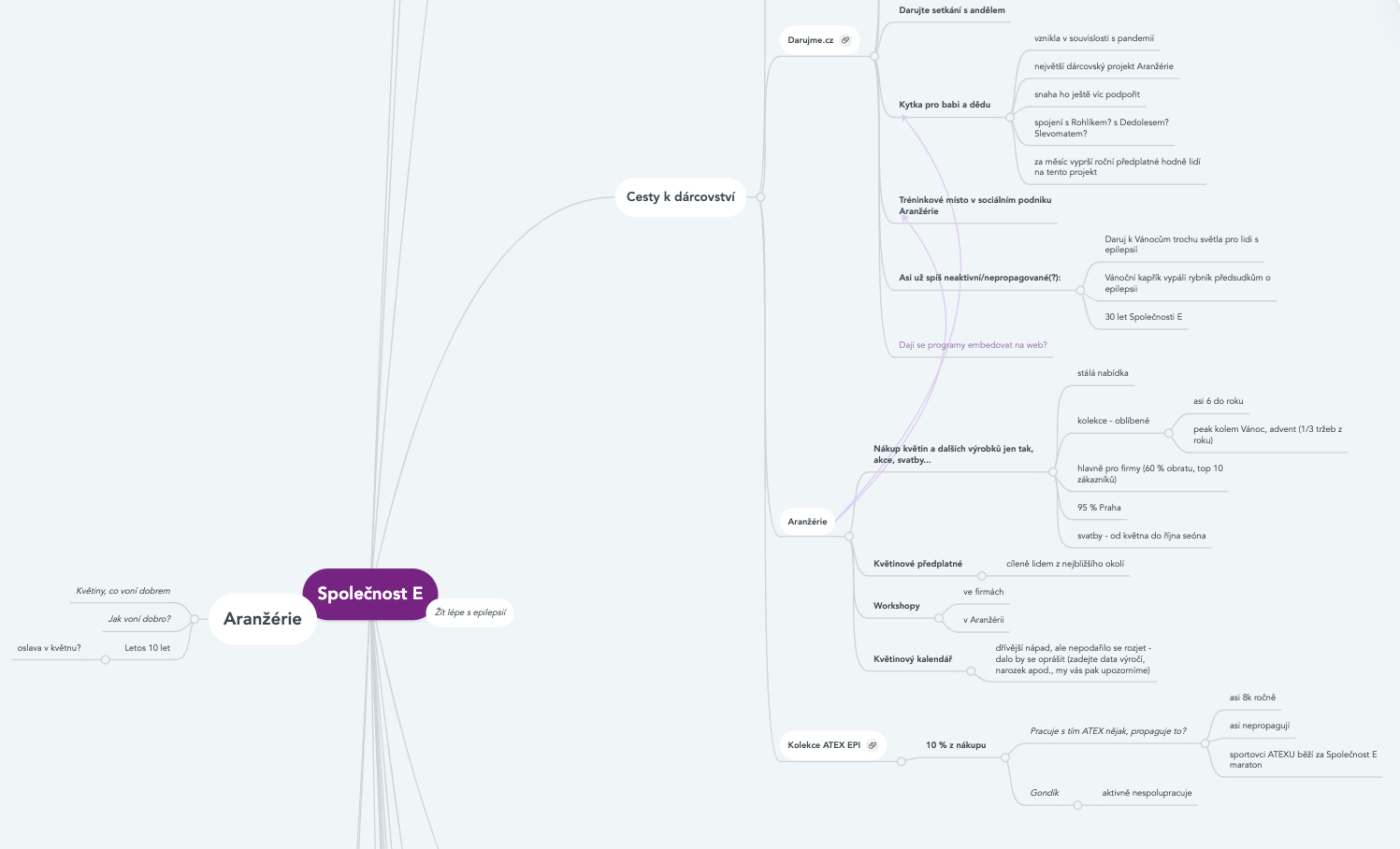 spolupráci jsme odstartovali strukturovaným workshopem, který jsme rozdělili do dvou dnů, abychom byli čilí a schůzka nebyla příliš únavná. Povídali jsme si o Společnosti E a Aranžérii jako o značce, o její vizi. Probrali jsme i brandové symboly, tón komunikace nebo cílové skupiny. Výsledkem byla jedna obrovská mind mapa shrnující vše, co jsme ke spolupráci potřebovali znát.