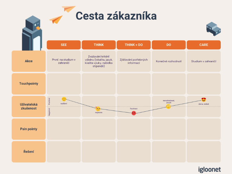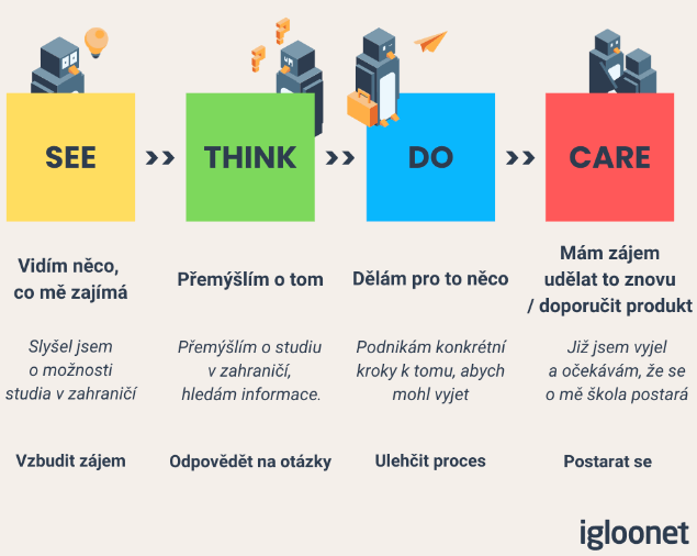 výstupem z výzkumu měla být především tematická analýza a cesta zákazníka, která ukáže celý proces rozhodování a nástupu na zahraniční školu. Navíc také doporučí, v jaké fázi a jak může VUT studenty zaujmout. Už při přepisu rozhovorů jsme odpovědi dělili nejen podle otázek, ale také témat, o kterých respondenti mluvili. Tato témata jsme rozdělili na několik fází zákaznické cesty dle modelu STDC (see think, do, care). Pro lepší představu přikládáme grafické znázornění: