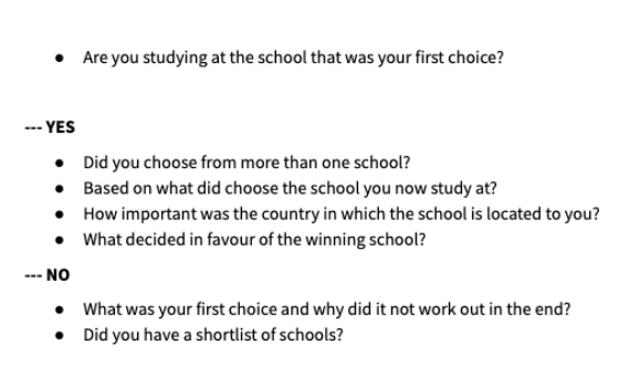 Každý z rozhovorů trval okolo dvou hodin. Díky semi-strukturovaným otázkám jsme se dozvěděli spoustu informací o celém procesu nástupu na zahraniční univerzitu. Ve vzorku se nám nakonec podařilo skloubit rozmanité respondenty v různých fázích procesu výběru či nástupu na zahraniční VŠ.