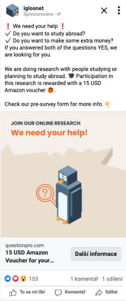 Rekrutace se nakonec ukázala jako velmi problematická. Nedařilo se nám nabírat dostatečně vhodné studenty pro zapojení do výzkumu. Potýkali jsme se s velkým množstvím falešných odpovědí a také s lidmi, kteří nesplňovali kritéria výběru. Spousta z nich nám také následně nereagovala na výzvy k zapojení do výzkumu. Nakonec jsme se rozhodli podpořit rekrutaci placenou reklamou na Facebooku. Cílili jsme na studenty VŠ i SŠ pocházející z Indie a studující v různých zemích. Reklama vypadala následovně: